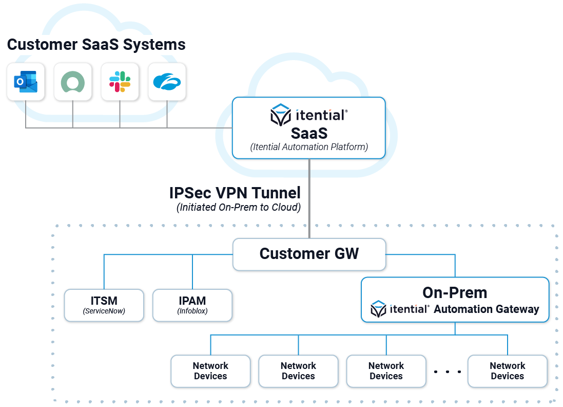 - Site-to-Site IPSec VPN Tunnel between Itential Cloud and the Customers Gateway is established to provide secure connectivity for communication to all customer end systems.