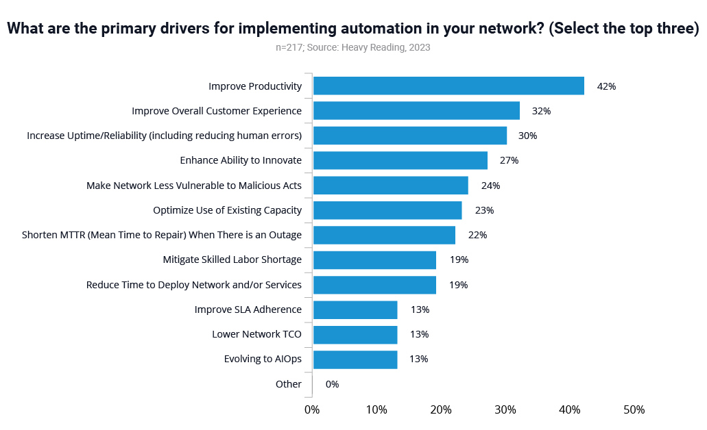 Further, when asked specifically about their own networks and the automation drivers they experience, several key areas came to light. The report states that “42% of respondents cited improving productivity, 32% picked improving overall customer experience, 30% named increasing uptime/reliability, and 27% chose enhancing ability to innovate — making these the top four drivers.”