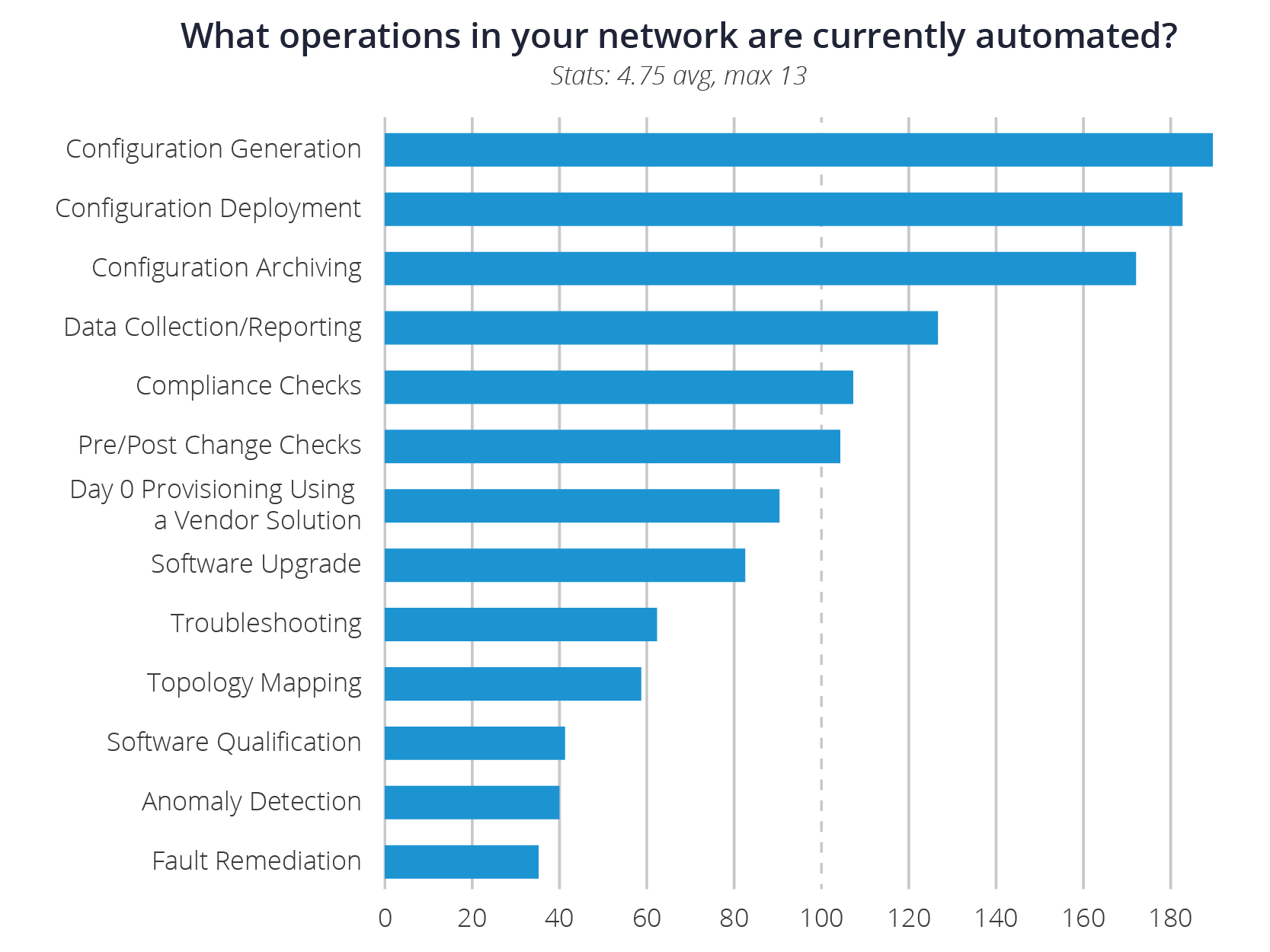 Another popular set of tasks to automate noted by the survey results are the processes around archiving and versioning configurations on different network devices. This also makes a lot of sense since quickly recovering from a hardware failure would require having the latest configuration available, and this is a task that doesn’t get a lot of attention until there actually is a hardware failure, which could be too late. This is a very common task with a lot of existing tools to that are easy to use and deploy. Again, the blast radius for this task is quite small, and the insurance it provides is considerable if there’s any kind of hardware problem or configuration drift.