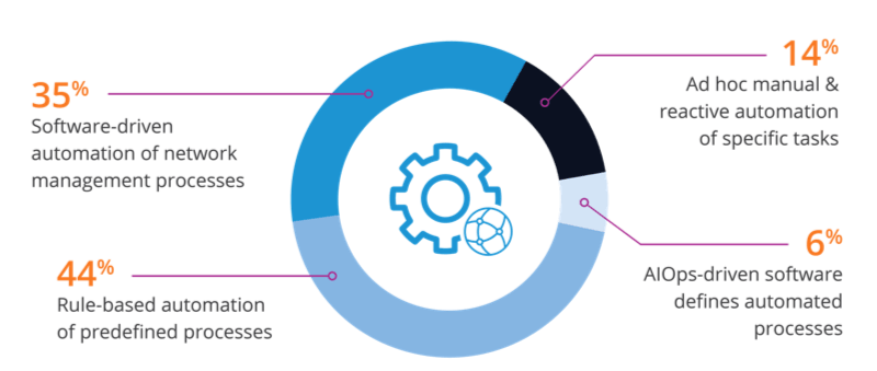14% of enterprises are still using tools that allow them to automate tasks, rather than business processes. But the largest group describes their automation as “rule-based,” in which tools automate a set of predefined network management processes in response to prescribed events or services. It’s no surprise that the percentages of software-driven and AIOps-driven efforts continue to rise fueling the drive for modernized network automation efforts.