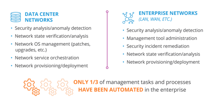 Even with the expansion of use cases across domains, only 1/3 of management tasks and processes have been automated in the enterprise. This highlights the difficulty network teams are facing executing successful and repeatable automation practices.