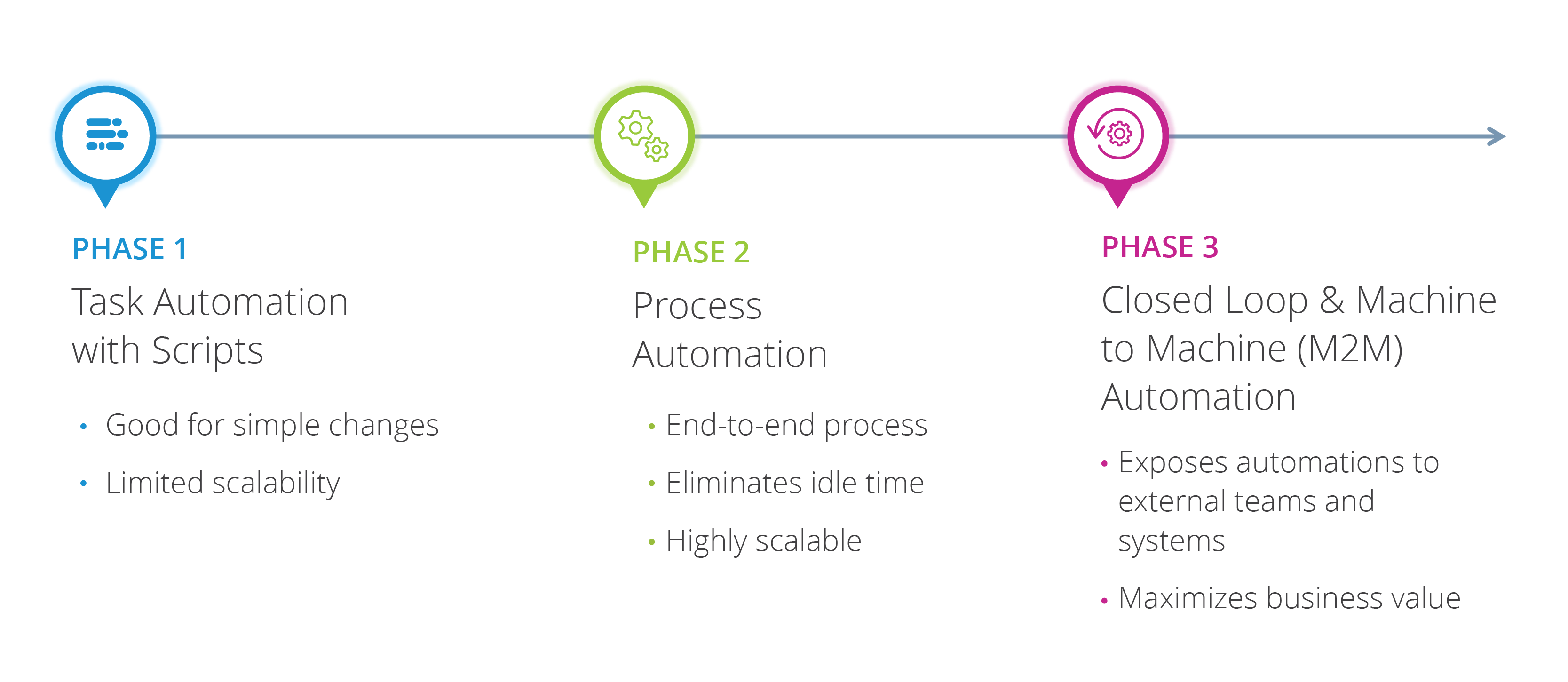 The second phase of an automation journey focuses on evolving from task-centric automation to process-centric automation. This typically requires more sophisticated tools, but the business benefits are significantly better than task-centric automation for a few reasons: