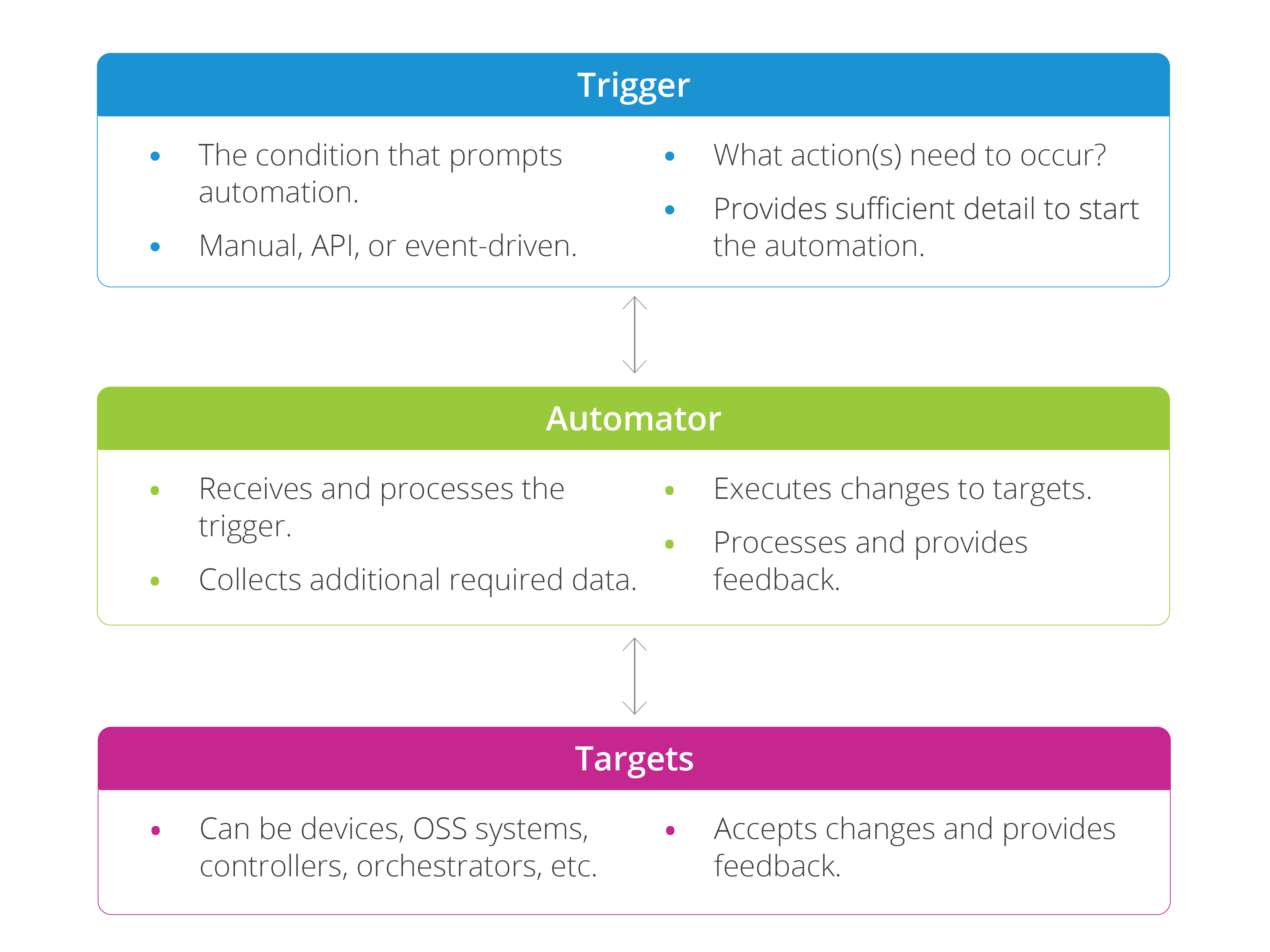 At a high level, the components of a backhaul automation solution are not that different than any other automation solution. There are events (or Triggers) that initiate the need for an automation to execute, there is an Automator that performs the automation, and there are Targets or the objects that the automation is performed on.