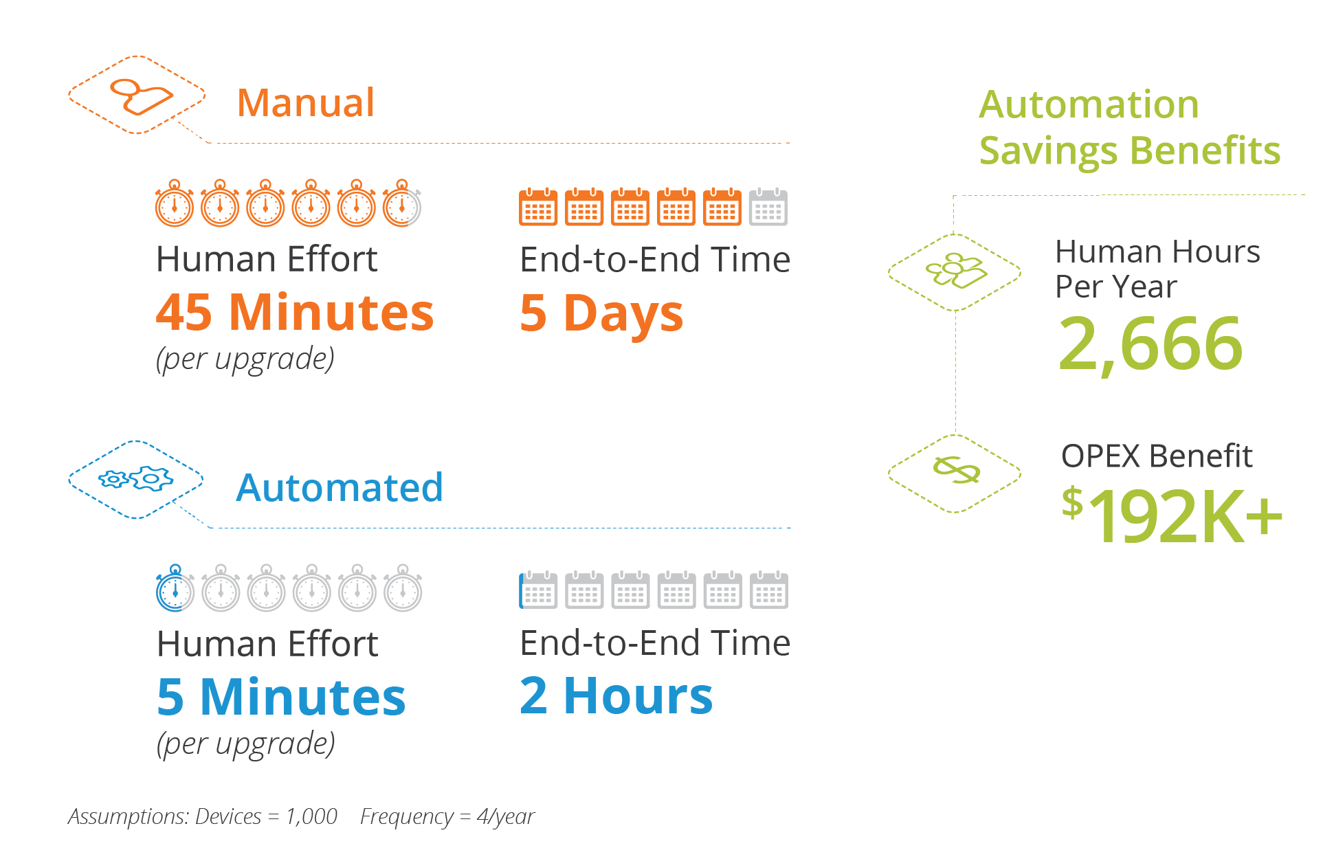 One of the most common networking use case, software upgrades, is a good starting point. By inputting a few simple numbers based on your specific environment, you can easily see the real value automation can bring.