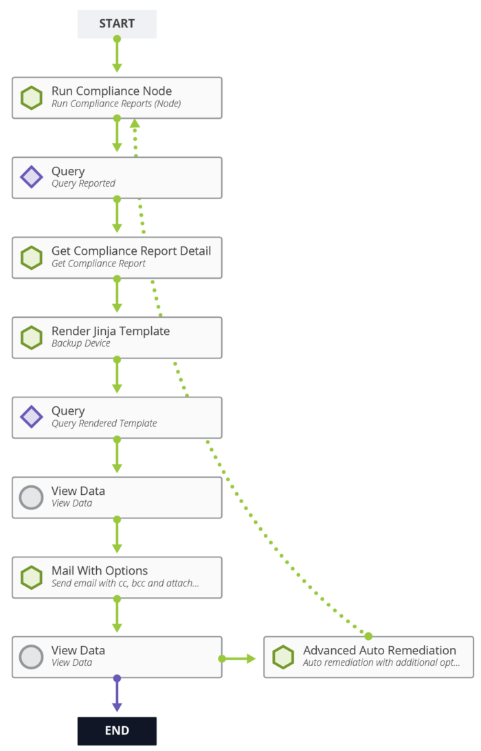 This is where the device group and Golden Configuration can both be utilized. Itential provides a low-code drag-and-drop canvas for building workflows that connect different automations together, allowing a single, end-to-end orchestration of the entire process: scanning devices, executing Golden Configuration, generating reports, and performing remediation. Learn how to build Itential workflows with these demos.
