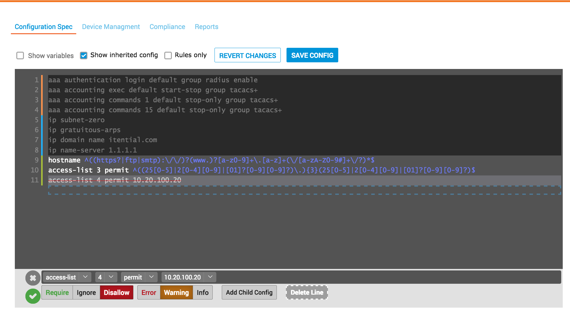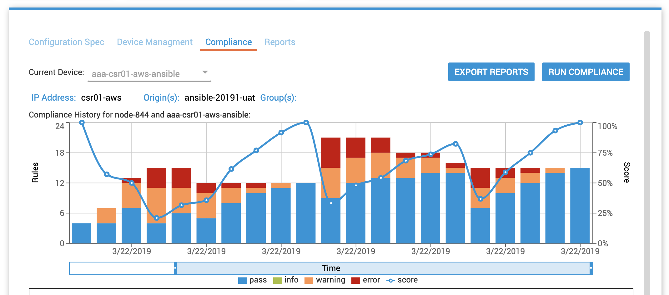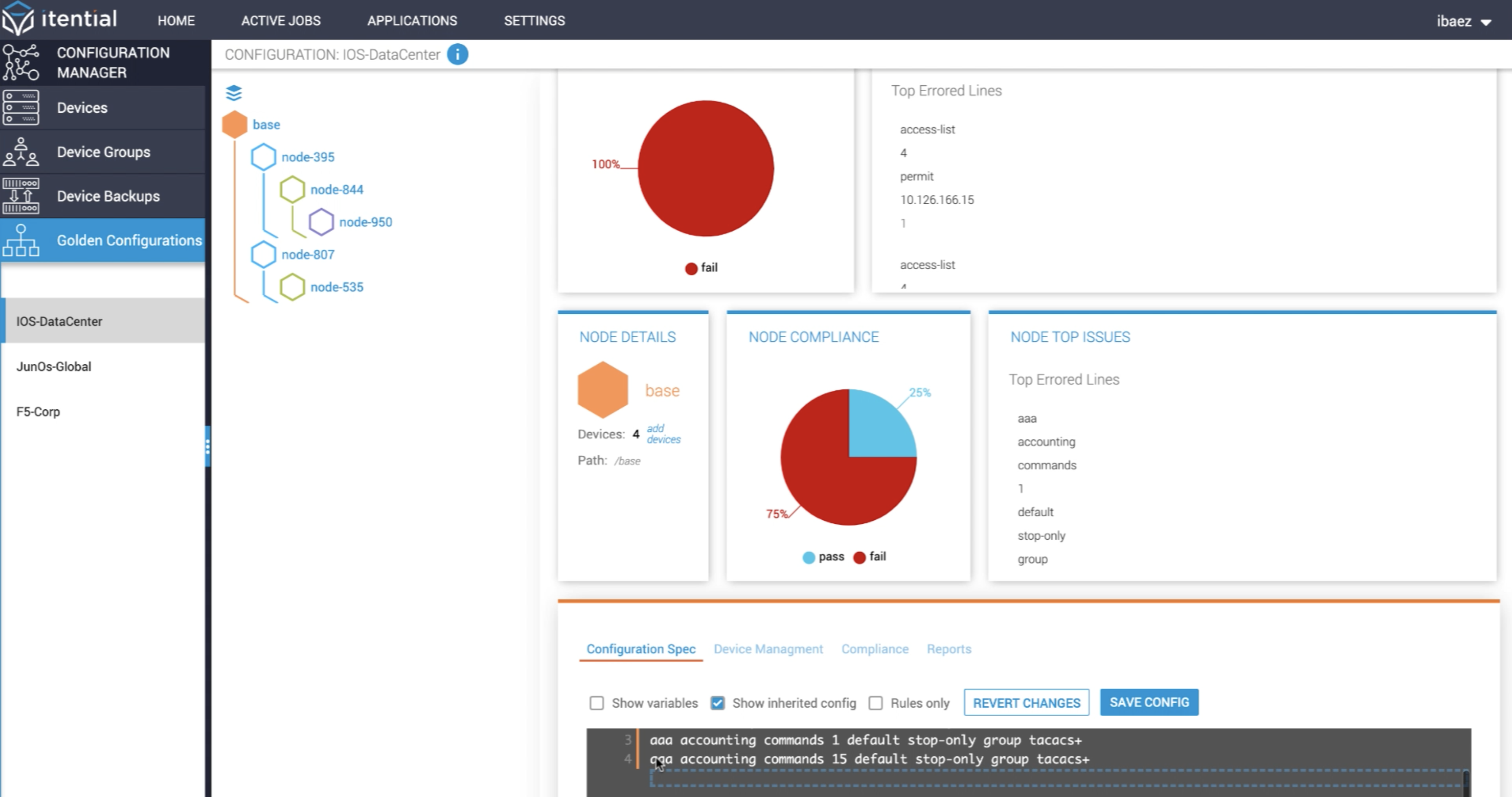 Achieve complete control over your network devices with access to detailed configuration drift analysis that makes compliance auditing a breeze. View current and historical device compliance scores and configuration drift details for each device. You have the flexibility to make configuration changes at the tree, node, and device level using native device configuration specs. Backups are automatically created when audit changes are applied to device configurations.
