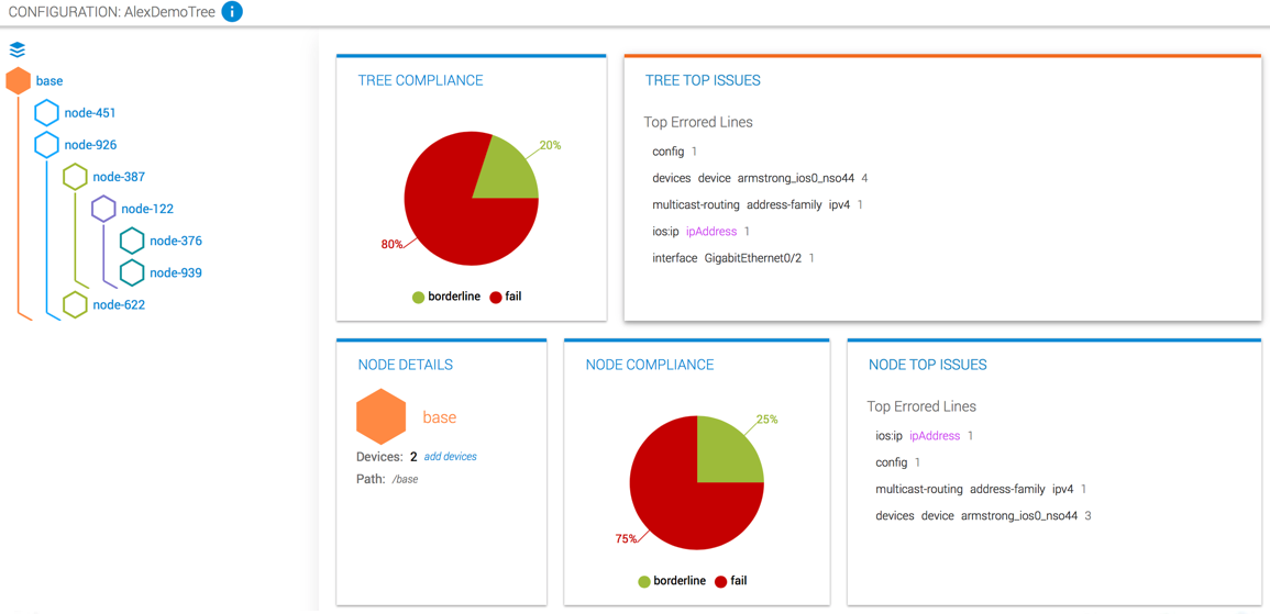 Gain complete insight into the compliance level of all your devices on the network through a consolidated dashboard that provides you top issues to remediate at the tree and node level. Easily identify nodes that are out compliance and view the device compliance analytics of an individual or group of devices that require remediation in order to maintain the desired network compliance level at all times.