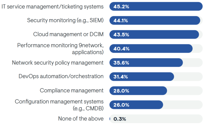 While some systems are prioritized by a larger group than others, the fact that only 0.3% answered ‘None of the Above’ shows that integrating network automation with some combination of IT systems is a key priority for almost every enterprise network team.