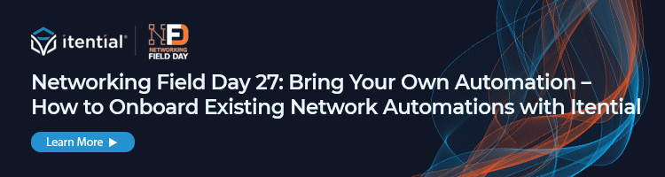 To learn more about how to Bring Your Own Automation and get a demo of Itential Automation Gateway, check out Peter’s full NFD 27 session. If you’re ready to give BYOA a try for yourself, create your free Itential account here.