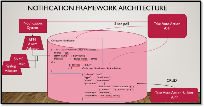 As evidenced by the architecture image above, the Notification Framework project primarily explored those goals through EPN and SNMP. The original use case was onboarding a new device, in which EPN Manager can detect a new device on the network, Pronghorn can then hear the new device notification from EPN, and Pronghorn can automatically kick off a workflow to onboard the new device into NSO. Future iterations could include enforcing compliance through Golden Config as well as any custom requirements for Inventory Management Systems.