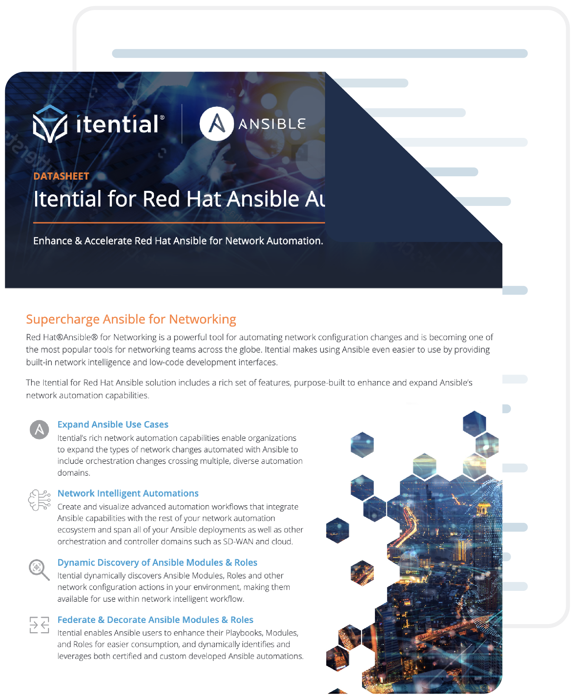 Red Hat®Ansible® for Networking is a powerful tool for automating network configuration changes and is becoming one of the most popular tools for networking teams across the globe. Itential makes using Ansible even easier to use by providing built-in network intelligence and low-code development interfaces.