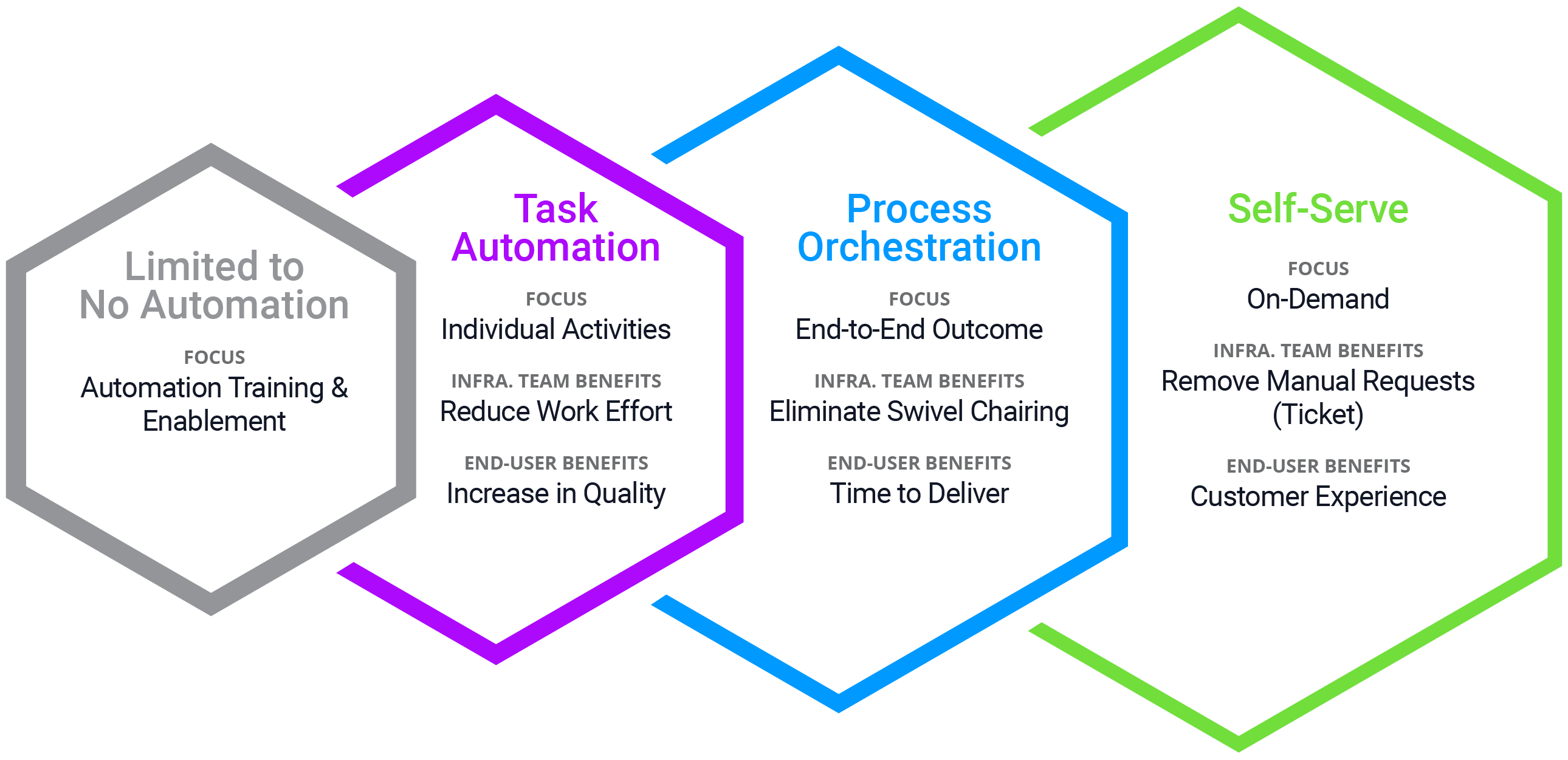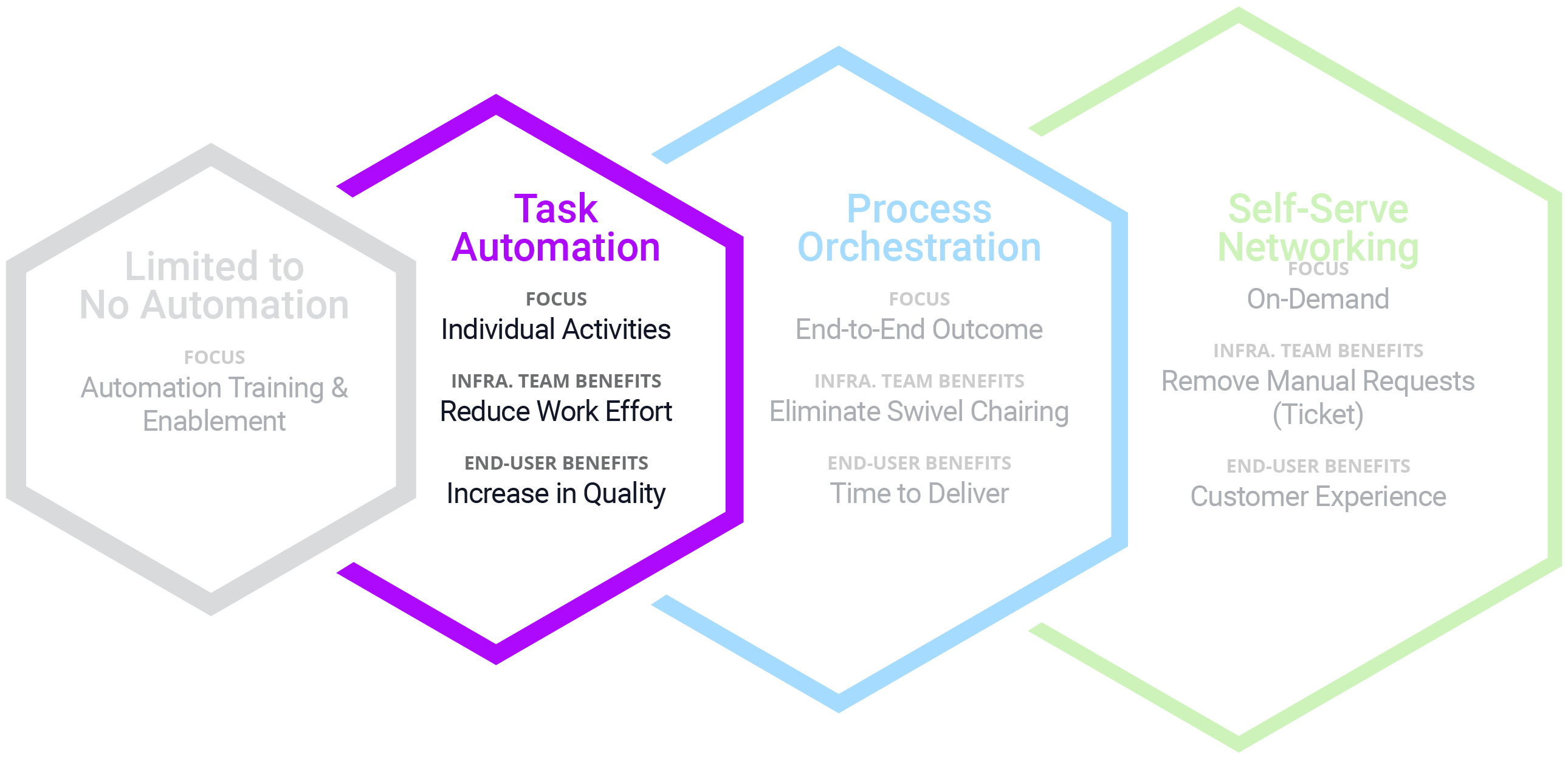 Progressing through the stages delivers increasing benefits: faster service delivery, reduced manual effort, improved consistency, greater scalability, and the ability to deliver network services as self-serve, cloud-like experiences. This evolution decouples network change volume from headcount and enables organizations to innovate more rapidly. [Source]