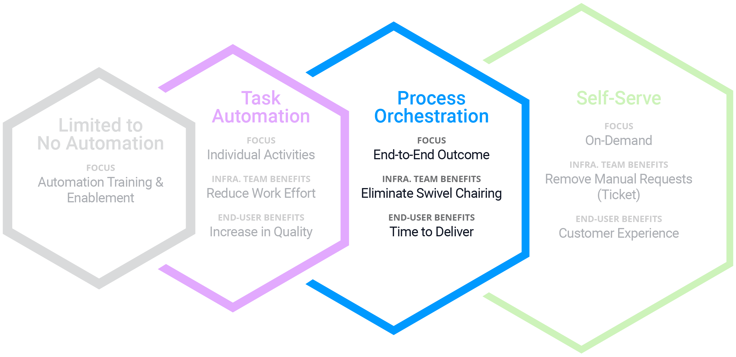 The Network Automation & Orchestration Maturity Model is a framework developed by Itential to help organizations understand and evolve their network automation journey. It outlines four stages—Limited to No Automation, Task Automation, Process Orchestration, and Self-Serve Networking—each representing increasing levels of automation scope, benefits, and complexity. The model helps teams identify their current state, set automation goals, and plan practical steps for evolution. [Source]