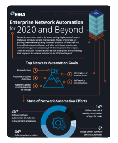 This infographic shares some of the highlights captured in a new survey from research firm Enterprise Management Associates, sponsored by Itential, on “Network Automation for 2020 & Beyond.” Download now to understand what enterprise organizations are doing today with network automation and to take a look into where network automation is heading into the future.
