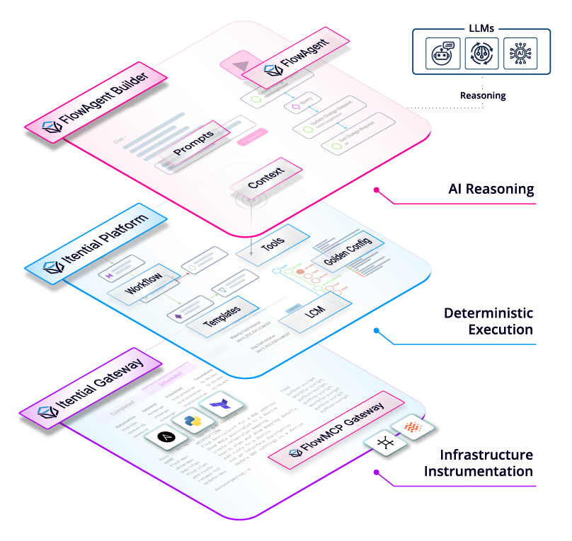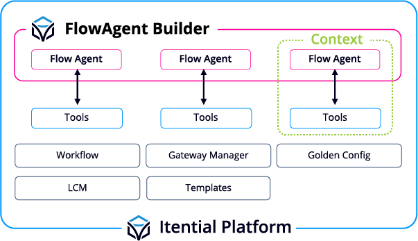 FlowAgents are infrastructure-aware agents built on the Itential Platform. They interpret intent, reason over operational context, and construct goal-oriented plans using natural language and platform knowledge. However, they do not execute changes directly; instead, they orchestrate workflows and hand off all actions to the deterministic execution layer for validation and enforcement.
