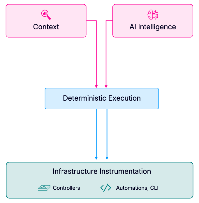 FlowAI is built on the principle of separating agentic reasoning from deterministic execution. This means that AI agents (FlowAgents) can reason, plan, and orchestrate, but all infrastructure actions must pass through a governed execution layer (FlowMCP) that enforces validation, RBAC, policy, and auditability. This separation is essential for safety, compliance, and scalability in enterprise environments.