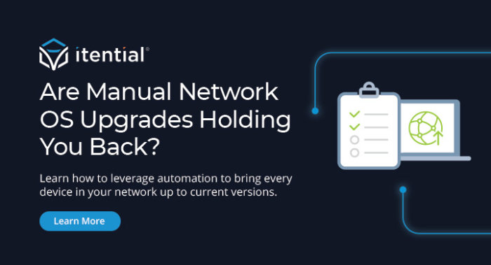 Automating Network OS Upgrades with Itential It is vitally important for every device on a network to have the latest software installed and operating on the device. This straightforward process alone is a critical component that helps to ensure the network is operating securely and reliably. Despite this fact, many enterprises are woefully behind in