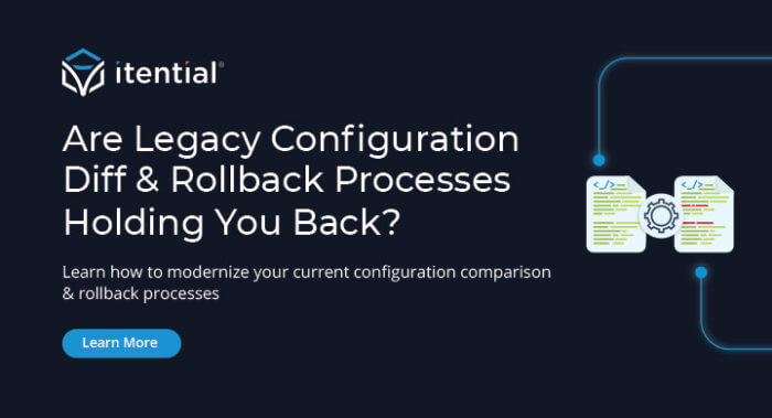 Configuration Diff Comparisons & Rollbacks with Itential The ability to “read” a configuration file to understand how different features and functionalities are configured for network devices is a skill needed to troubleshoot a non-working device and compare it to a previously “known-good” configuration file. If there are any differences detected, it may be necessary to